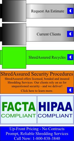 Please click here for more information, or give us a call at 1-800-838-3840 to find out how ShredAssured can help you save money, protect your information, and comply with federal and state laws. Our client specialists are ready to assist and willing to help in any way they can.